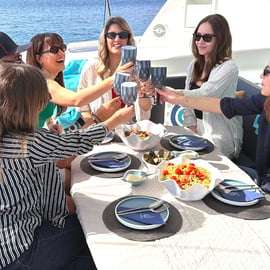 Na pokładzie możesz skosztować pysznych greckich przekąsek, w tym świeżych owoców morza, śródziemnomorskich dipów, lokalnych serów i świeżo upieczonego chleba. Delektuj się greckim winem, piwem lub orzeźwiającymi napojami bezalkoholowymi, podziwiając piękno otwartego morza.