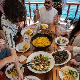 W trakcie rejsu goście mogą skosztować tradycyjnej greckiej uczty na pokładzie. Delektuj się śródziemnomorskim bufetem, który prezentuje najświeższe składniki z regionu. Uzupełnij posiłek nieograniczoną ilością napojów bezalkoholowych, piwa i wina, relaksując się na pokładzie i podziwiając panoramiczne widoki.