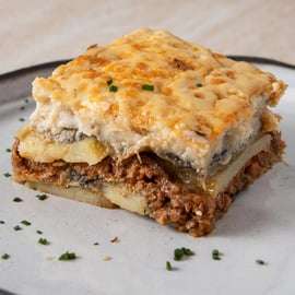 klasyczne greckie danie z warstwami bakłażana, przyprawionego mięsa mielonego i kremowego sosu beszamelowego