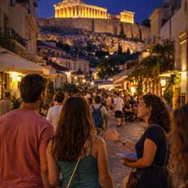 Wędrówka kończy się na placu Monastiraki, gdzie starożytne ruiny, tętniące życiem ulice i oświetlony Akropol łączą się w jeden niezapomniany widok.