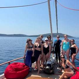 Gdy słońce zacznie zachodzić, poczuj ciepłą bryzę i podziwiaj panoramę połyskującej Zatoki Sarońskiej. Pierwszym przystankiem jest Varkiza, gdzie możesz wprost z łodzi zanurkować w krystalicznie czystej wodzie i zażyć orzeźwiającej kąpieli. Po powrocie na pokład delektuj się obfitym bufetem z potrawami z greckiego grilla oraz drinkiem powitalnym i pij piwo, wino, napoje bezalkoholowe i wodę do woli przez cały czas trwania rejsu.