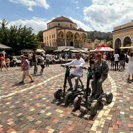 Nasza przygoda zaczyna się w urokliwej dzielnicy Plaka, najstarszej i najbardziej malowniczej części Aten. Gdy słońce już świeci, bierzemy sprzęt i wsiadamy na nasze elektryczne hulajnogi, gotowi odkrywać bogaty historyczny krajobraz miasta.